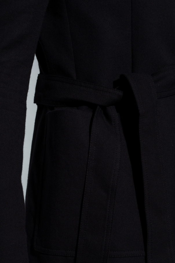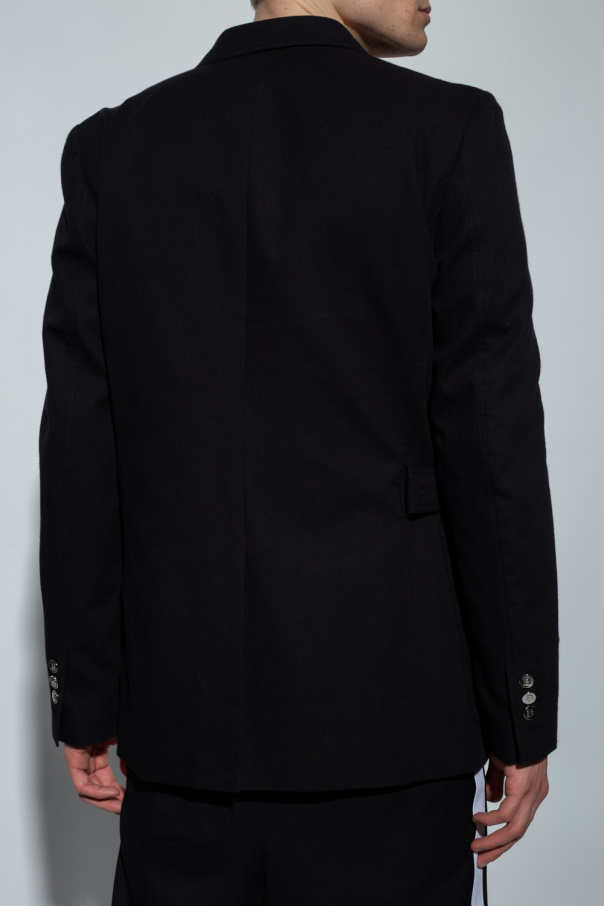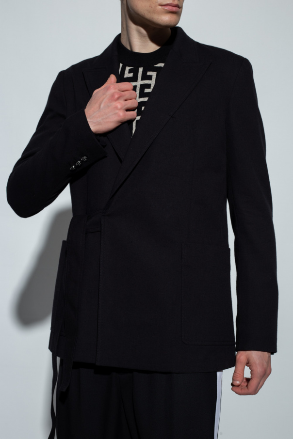 Black double-breasted blazer with peak lapels from Balmain. Made of a cotton and wool blend, this garment features buttons with a concealed placket, ties on the side, two front pockets, long sleeves and a single rear vent.