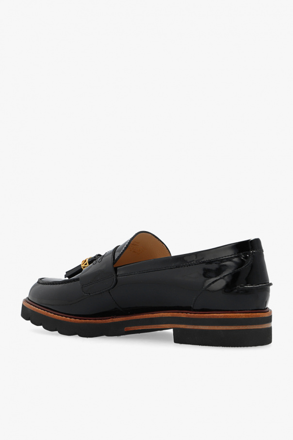 Black ‘Manila’ loafers from Stuart Weitzman. Made from patent leather, this model sits on a brown and black rubber sole and features a distinctive strap with tassels and gold-tone metal applications.