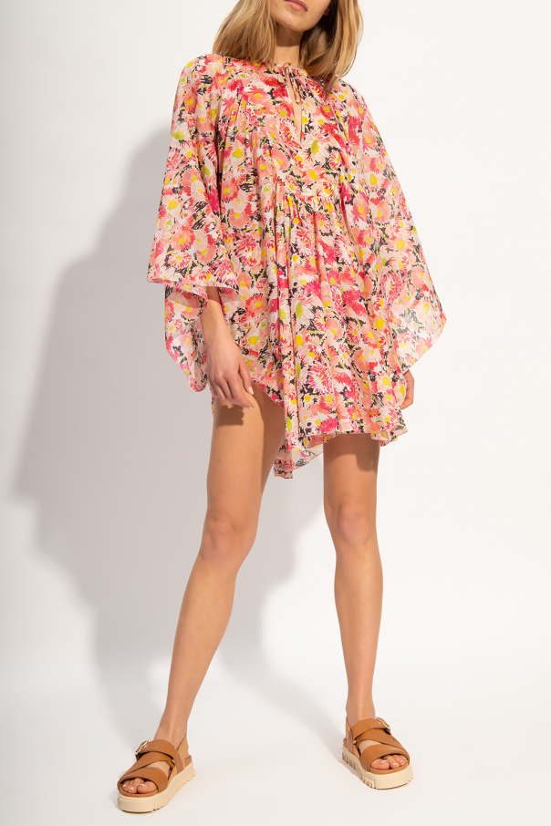 Multicolored ‘Watercolour Floral’ beach dress from Stella McCartney. Crafted from cotton, this flared design features a floral motif, tie neck and short sleeves.