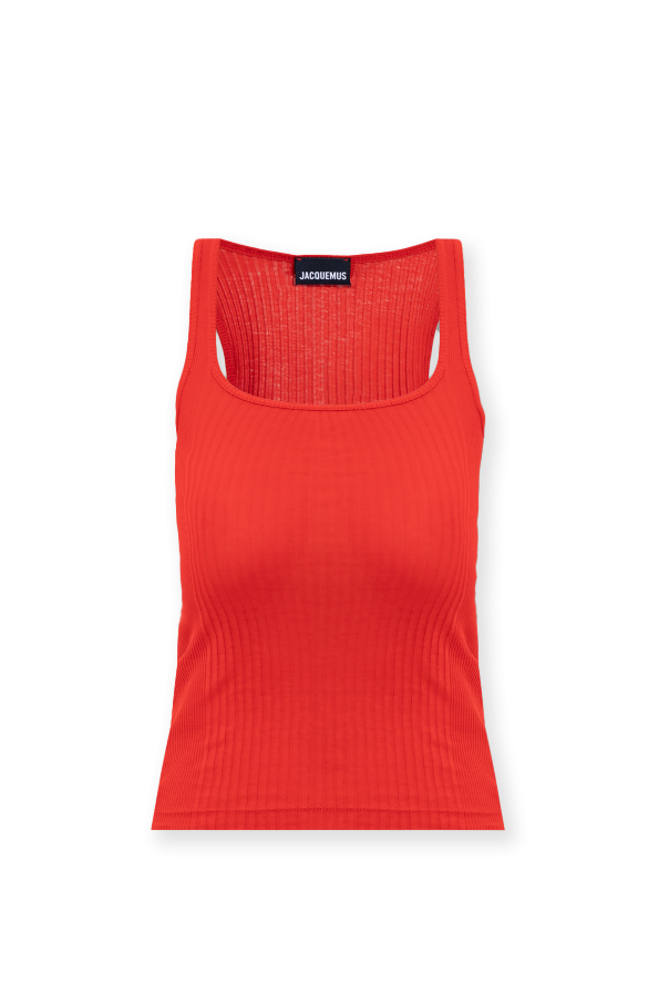 Red ‘Caraco’ tank top from Jacquemus. Crafted from ribbed cotton, this style features a round neck and logo patch at the back.