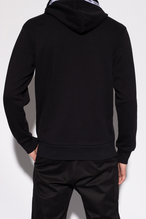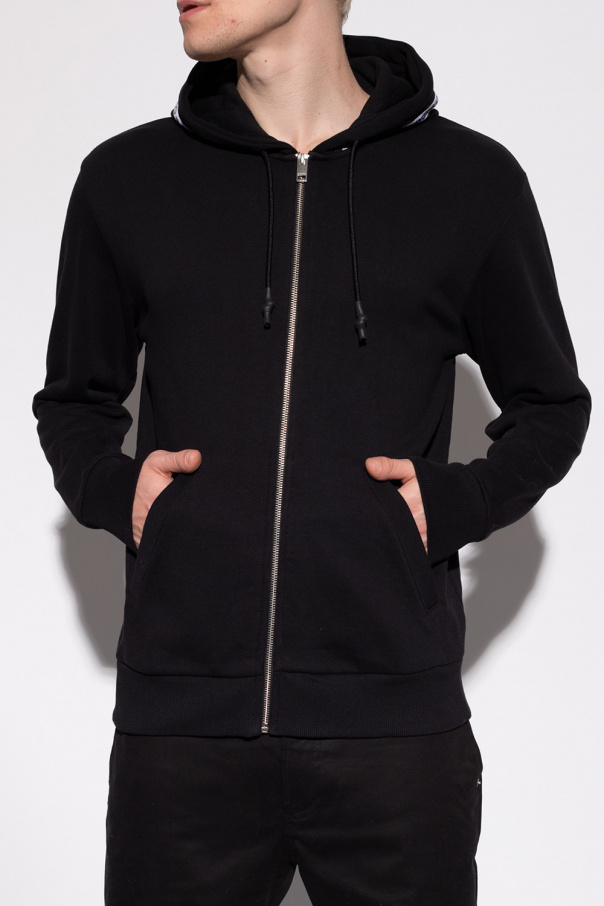Black hooded sweatshirt from Diesel. Crafted from cotton jersey, this hoodie showcases a zip fastening, a drawcord-adjustable hood accentuated with an embroidered stripe with a white and black tactile logo, two slip pockets and a ribbed bottom hem and cuffs.