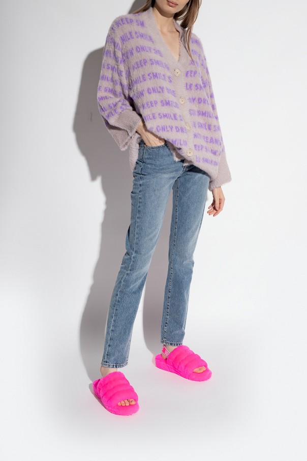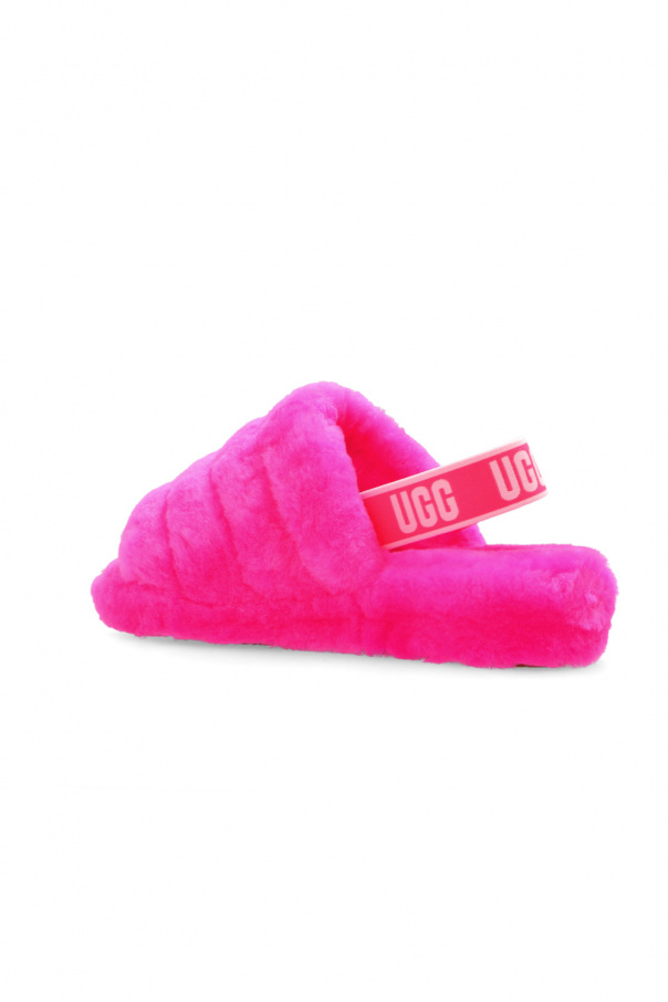 Neon pink ‘Fluff Yeah’ sandals from UGG. Made of plush shearling, this pair features an elastic strap embroidered with a white logo and rests on a brown rubber sole.