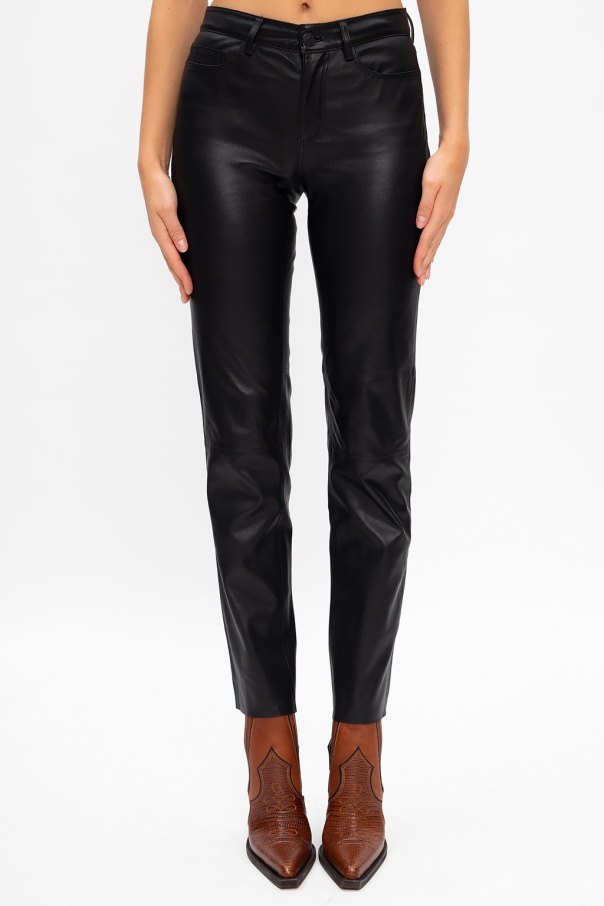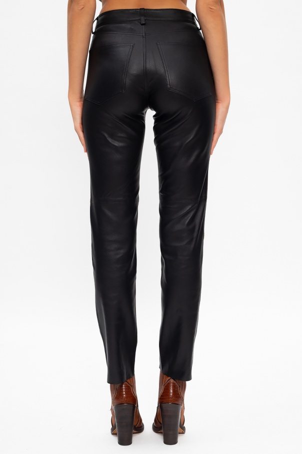 Black trousers from Samsoe Samsoe. Crafted from leather, this tapered leg design features zip and button fastening, two front pockets and two back pockets.