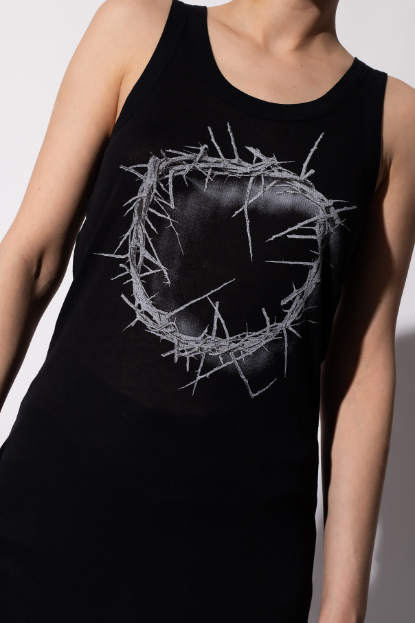 Black sleeveless top from Ann Demeulemeester. This round neck design is decorated with a white print.