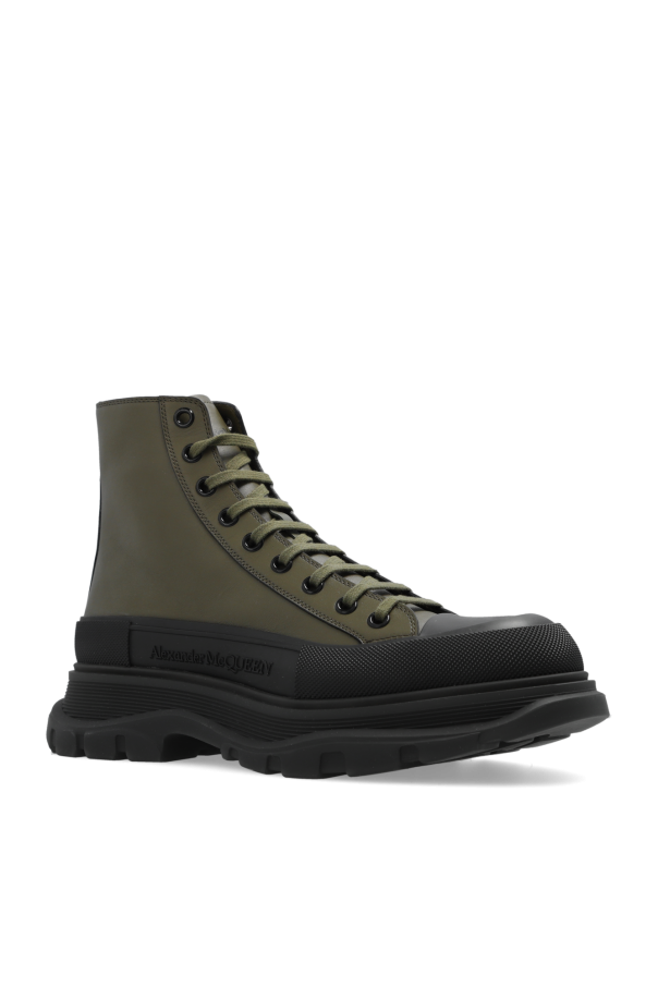 Dark green platform boots from Alexander McQueen. Crafted from leather, this lace-up pair features a logo detail and black chunky sole in rubber.