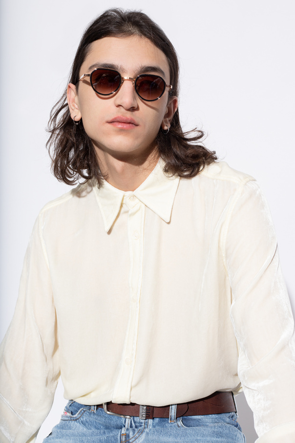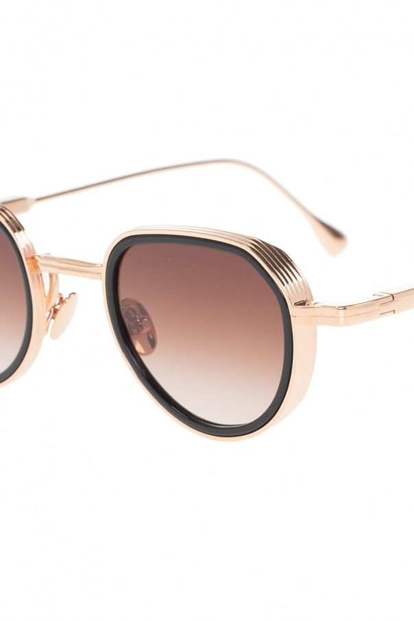 Black and gold-tone ‘Scarlett’ sunglasses from John Dalia. This model features rims carved out of a 8mm engraved metal strip, the brand's signature double bridge, traditional end pieces, a frame and temples treated with a rose gold as well as brown gradient G15 CR39 lenses with AR treatment. Case and cleaning cloth included.