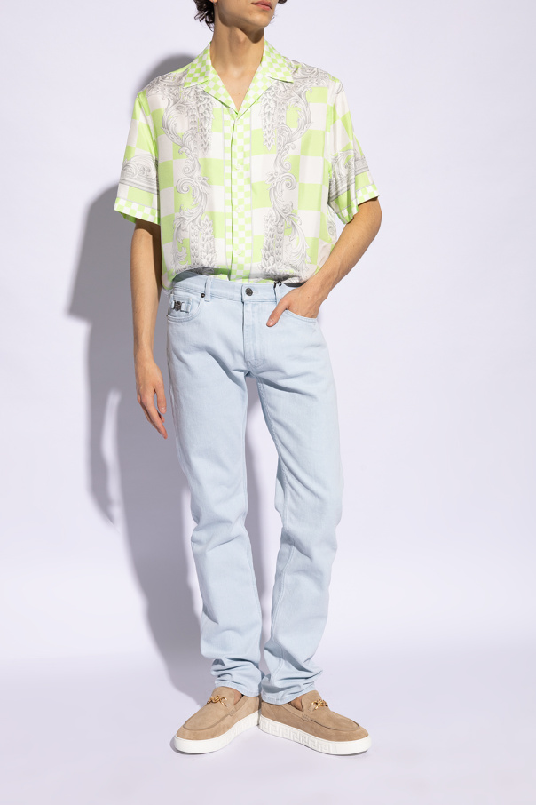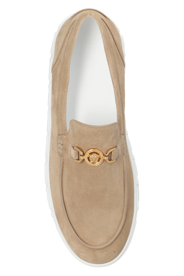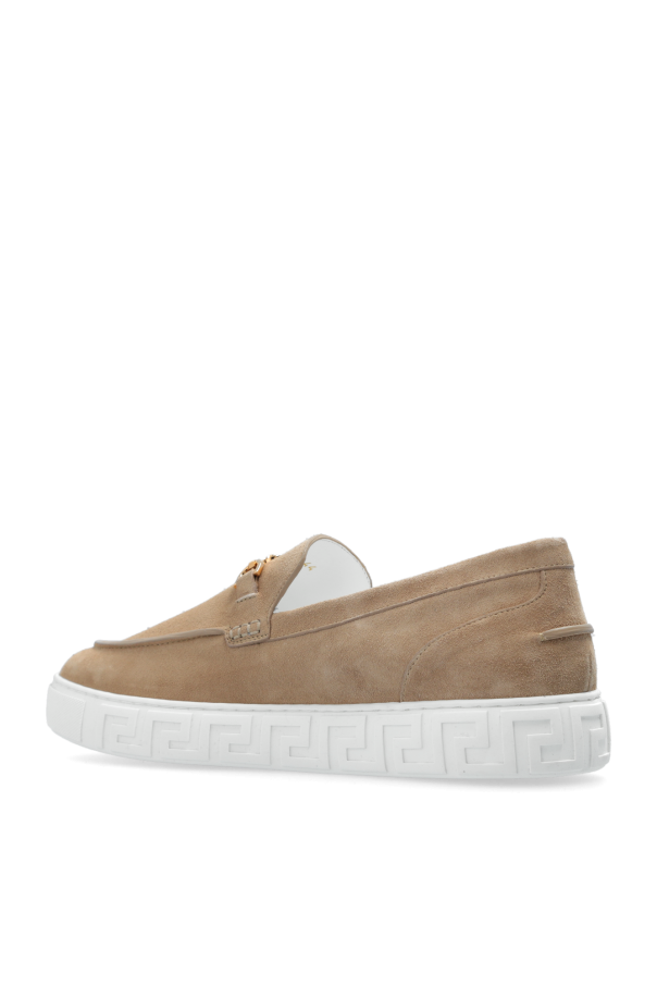 Beige loafers from Versace. Made of suede, this model sits on a white rubber sole and showcases gold-tone hardware with the brand's signature Greca and Medusa head motifs on the front.