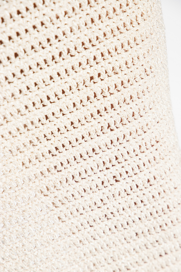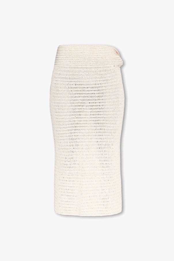 Cream ‘Ejo’ crochet skirt from The Mannei. Made of cotton, this design features concealed zip and hook, a side slit and decorative knot.