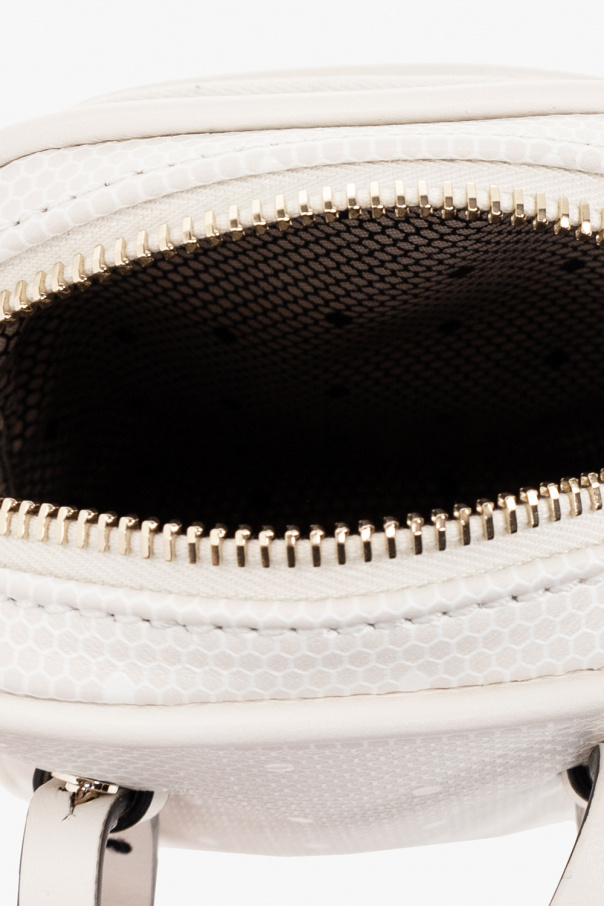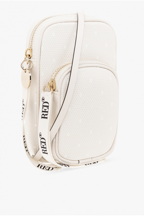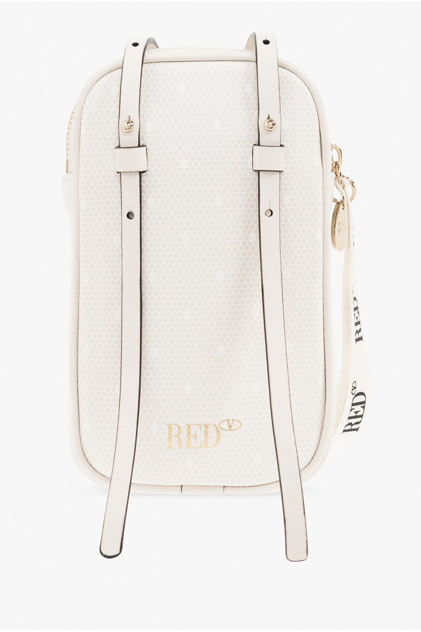 Cream and white phone pouch from Red Valentino. Made of calf leather, this model features a zip fastening, gold-tone logo print, adjustable shoulder strap, front zip pocket, one internal compartment and gold-tone metal hardware.