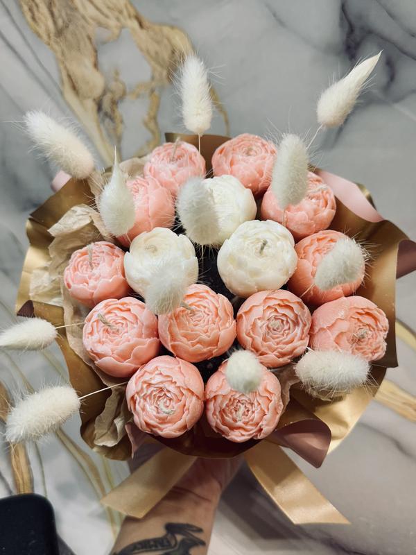 В букете 15 пионов,гипсовая подставка для зажигания свечи в подарок.Состояние: НовоеЦвет:- Розовый