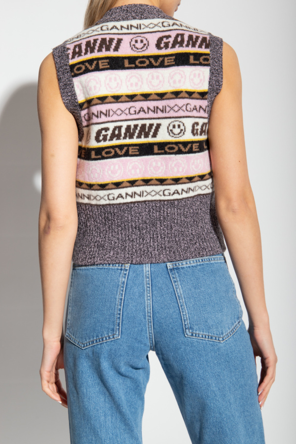 Multicoloured vest from Ganni. Crafted from a fabric blend including wool and recycled polyamide, this style features a logo pattern, a V-neckline and elasticized trims on the shoulder edges and bottom hem.