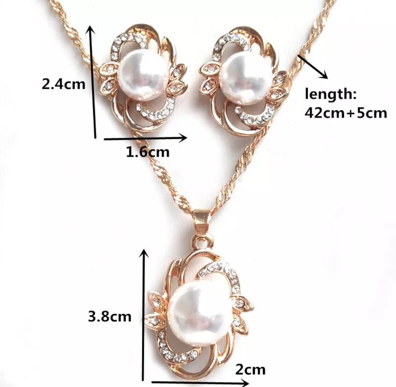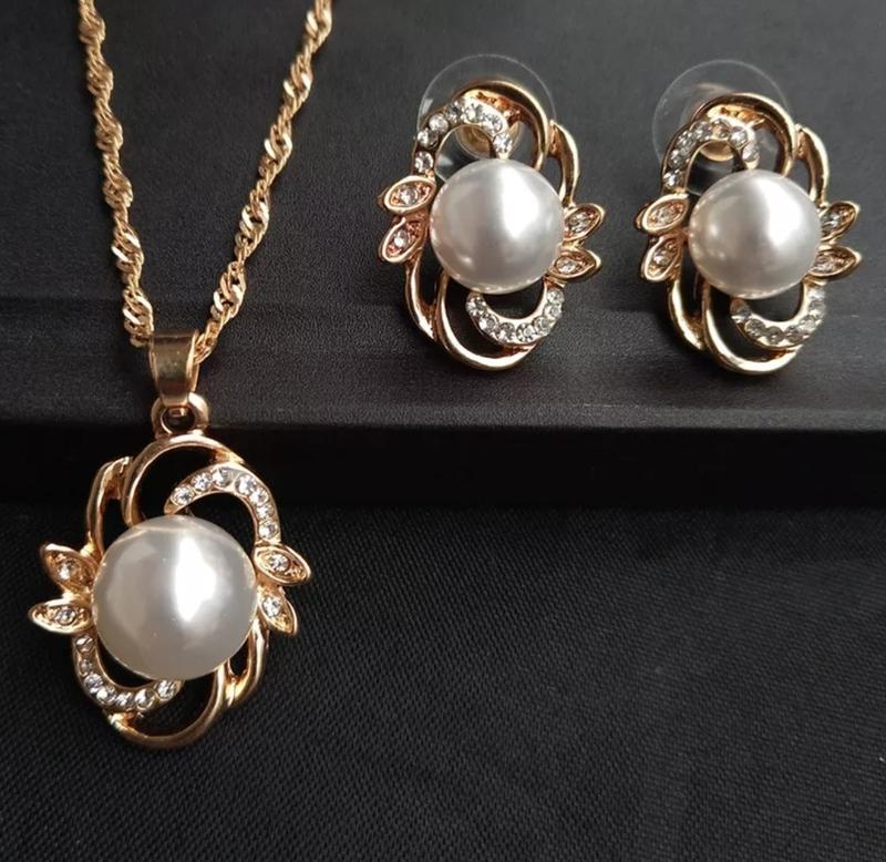 искусственным жемчугом. Серьги аналогичны подвеске. Украшение в золотом цвете.
