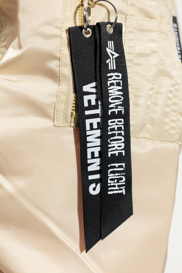 Light beige and orange reversible bomber jacket from VETEMENTS x Alpha Industries. This oversize design crafted from shiny fabric is complete with two-way zips, two snap-fastened pockets, multiple pockets on the shoulder, black tag with a logo, two detachable keyrings with logo charms and ribbed trims at the collar, hem and cuffs.