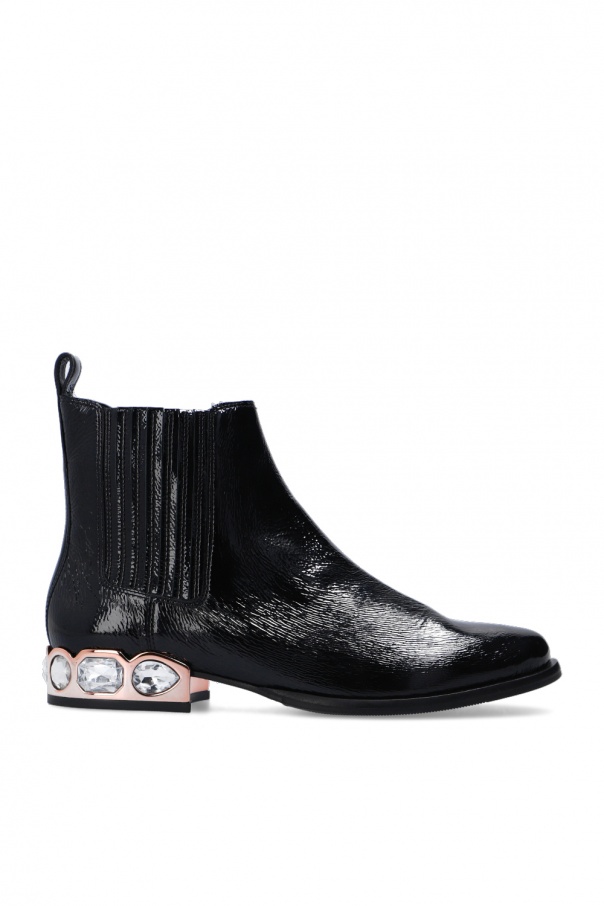 Black ‘Bessie’ heeled ankle boots from Sophia Webster. Crafted from textured leather, this slip-on design features a rose gold-tone heel embellished with silver-tone crystals and a black sole made of leather and rubber.