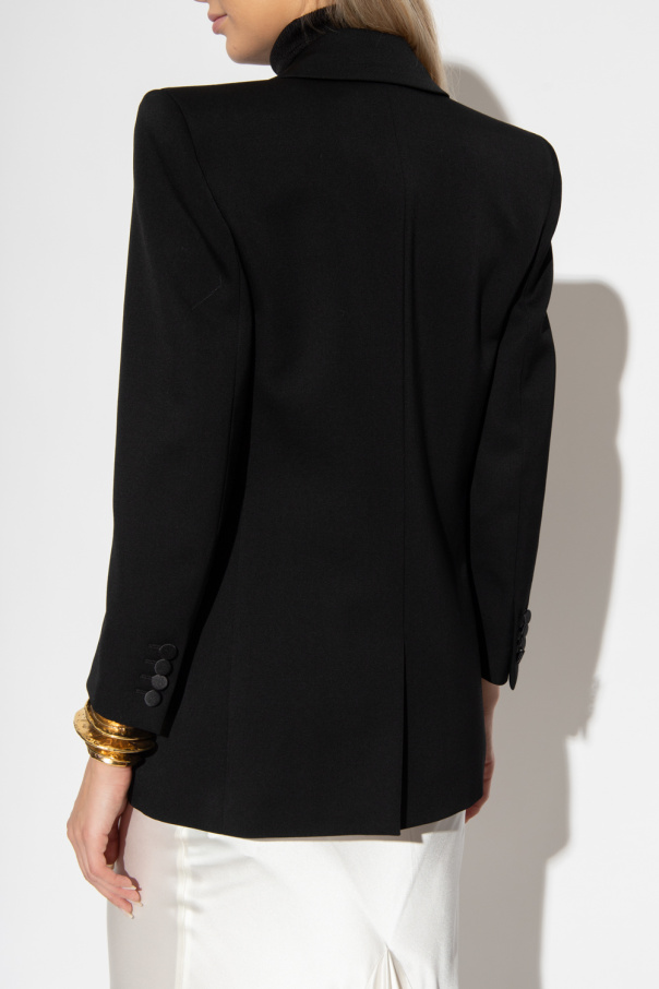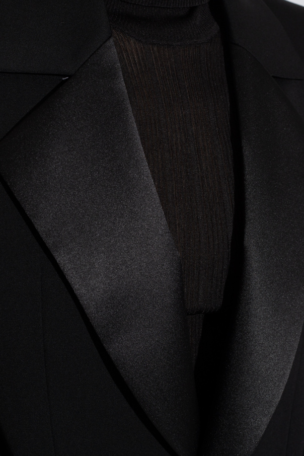 Black blazer from Saint Laurent. Crafted from wool, this style features a single button closure, a collar with satin notch lapels, one slip pocket, two flapped pockets, sculpted, padded shoulders, a single back vent and long sleeves with button cuffs.