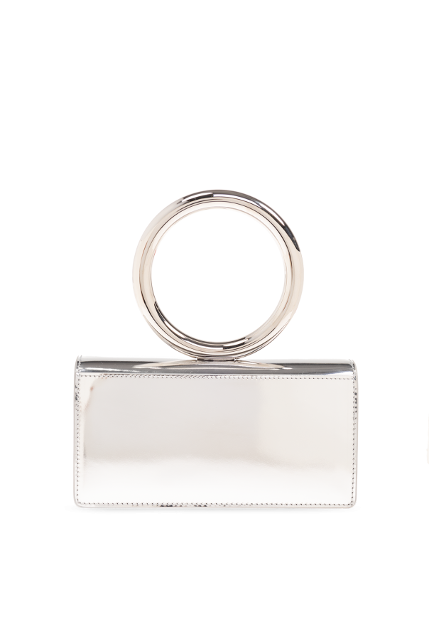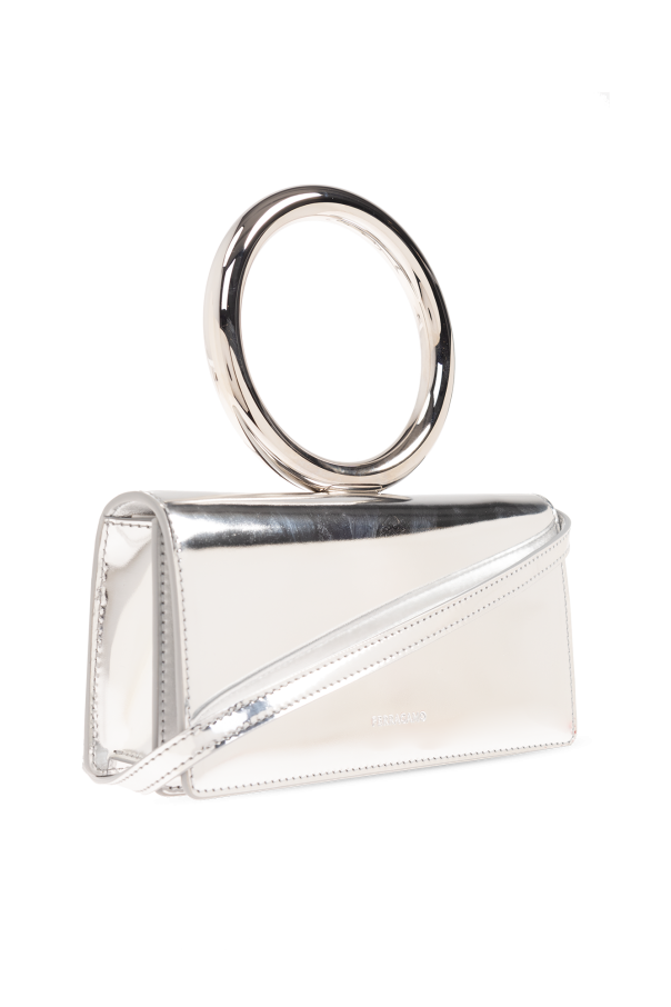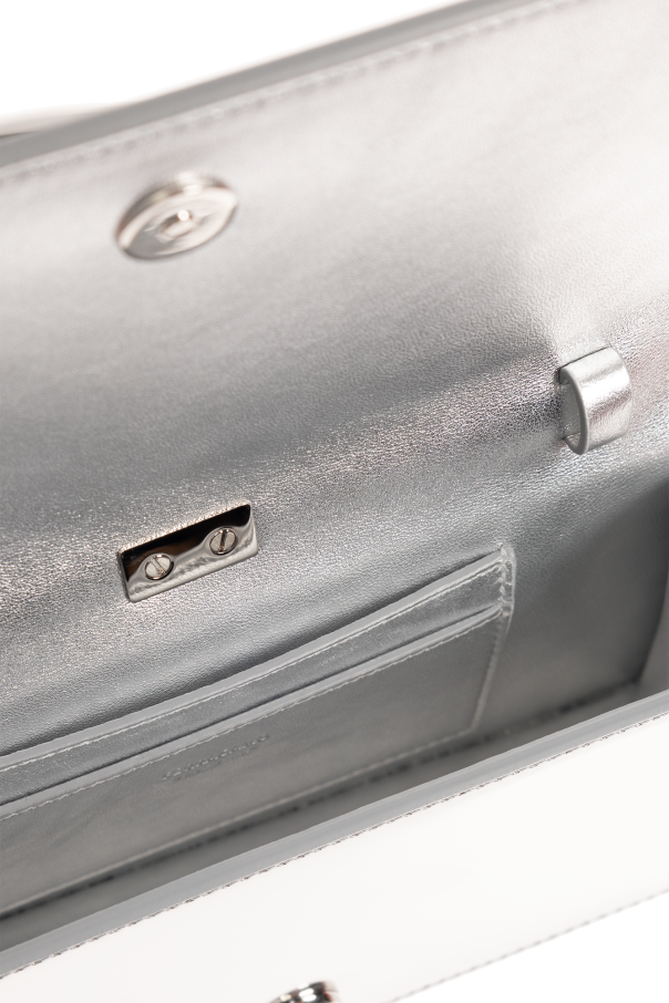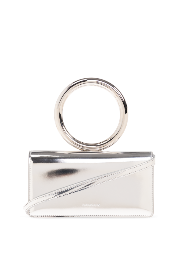 Silver-tone shoulder phone holder from FERRAGAMO. Made of patent calf leather, this item secures with a magnetic snap and showcases an embossed logo on the front. It is complete with a long and detachable strap, one metal handle, silver-tone metal hardware and one internal compartment with two card slots.