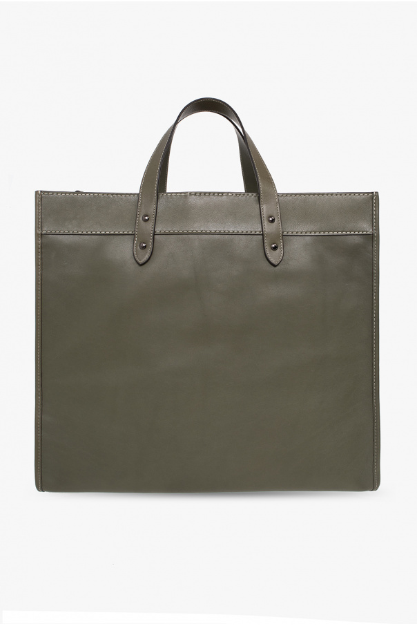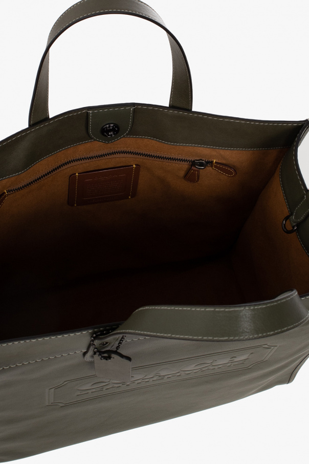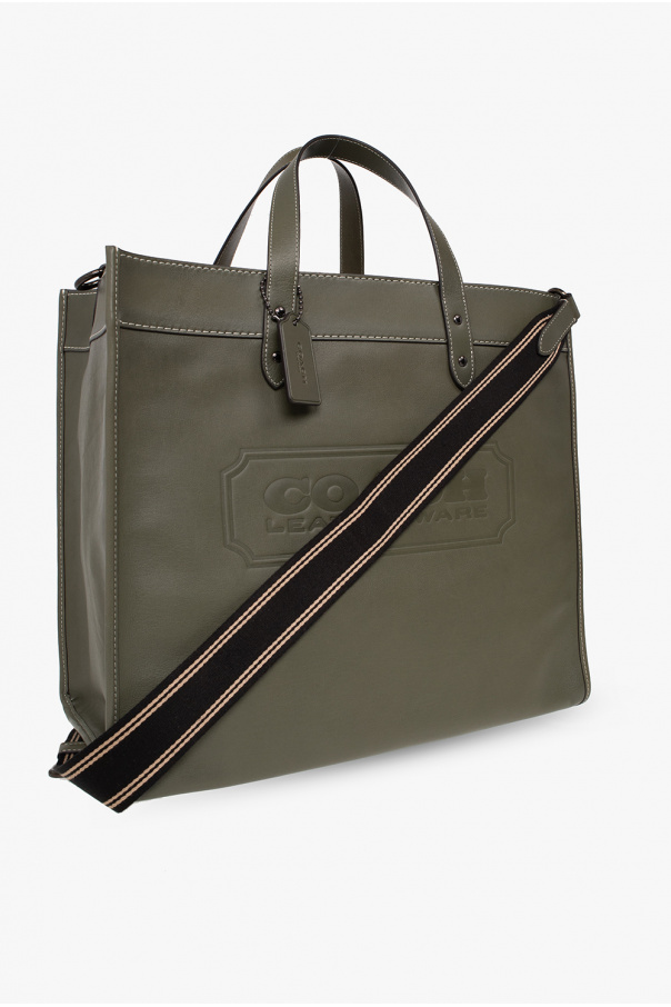 Dark green ‘Field 40’ shopper bag from Coach. Crafted from calf leather, this design secures with a snap and showcases an embossed logo, two half-round handles, a detachable and adjustable strap in black and beige, dark silver-tone metal hardware and one internal compartment with a zip pocket.
