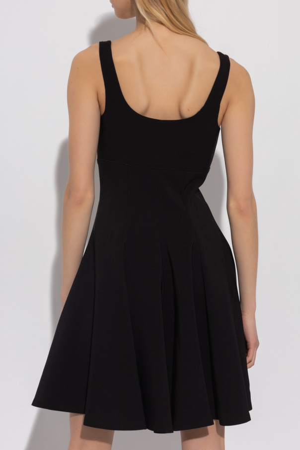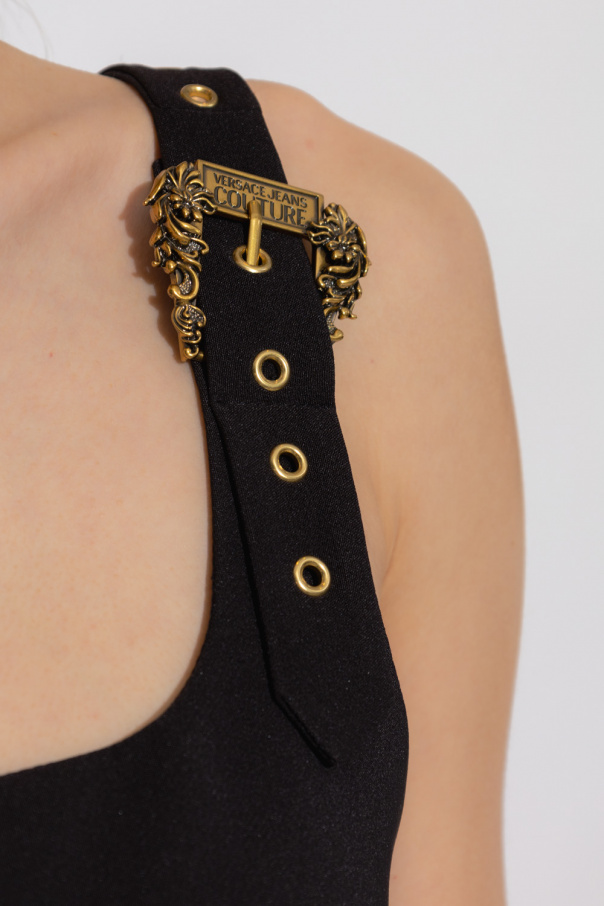 Black dress with straps from Versace Jeans Couture. Fastened with a zip and hook, this flared design features a strap with decorative logo-embossed buckles.