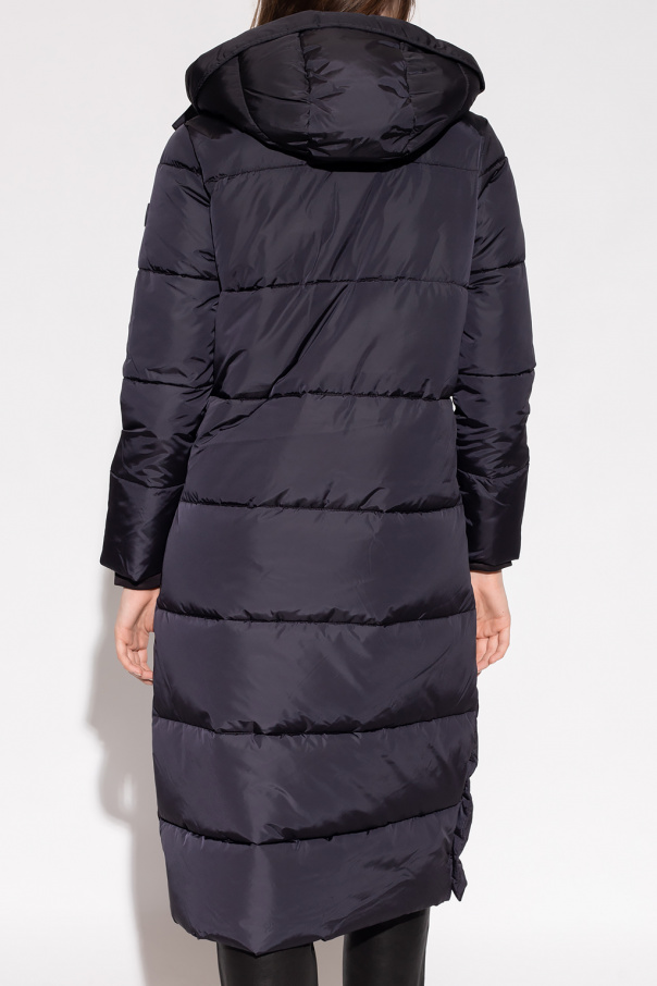 Long, navy ‘Colette’ insulated jacket with a detachable hood from Save The Duck. Made of fabric with the Oeko-Tex® certificate, this garment features synthetic Plumtech® down insulation, two-way zip, quilting, rubber logo patch on the shoulder, detachable drawstring hood, two pockets, snap fastenings on the sides and long sleeves with ribbed cuffs. Temperature range from -5°C to +10°C.