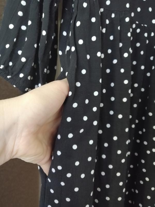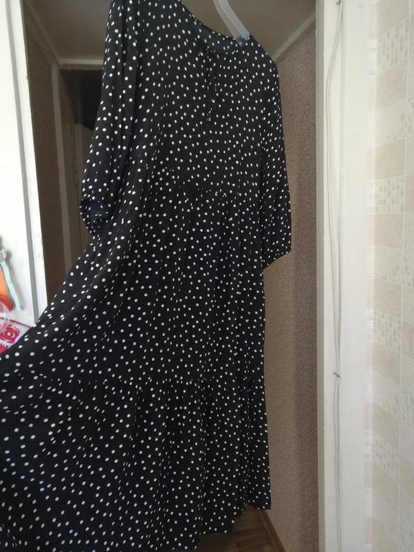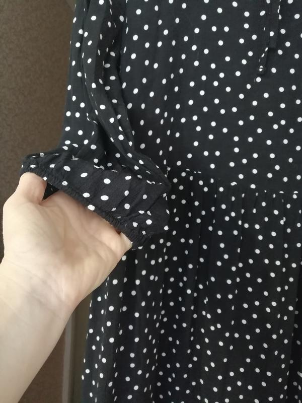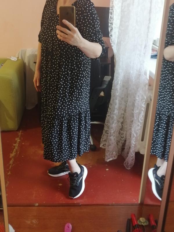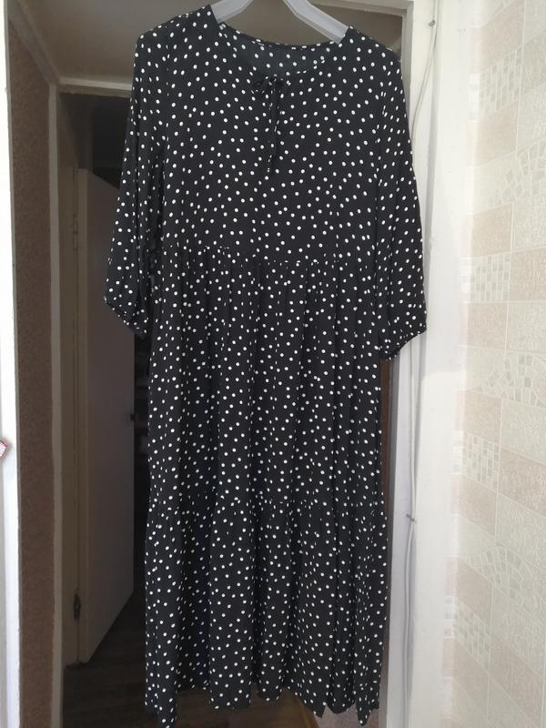 Wakiki, размер L, красиво садится. 100% вискоза. Первый ярус выше талии, второй снизу. Замеры:Длина от плеча 120см,ширина плеч 40см, ширина под руками 51см,рукав от плеча 47см(3/4),ширина где начинаются складки 49см. На фото грудь 106 см, тесно, на грудь меньше будет супер.Состояние: ИдеальноеЦвет:- Чёрный