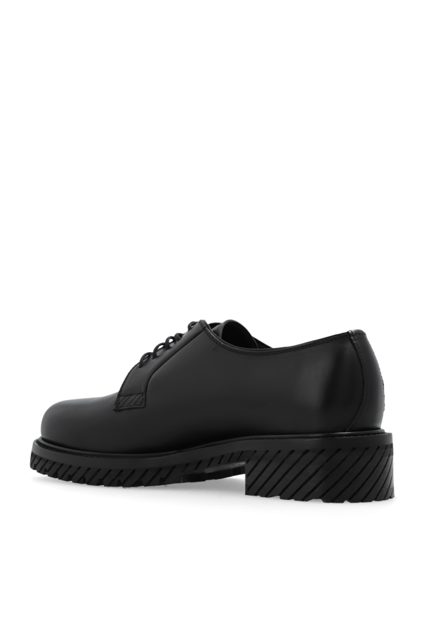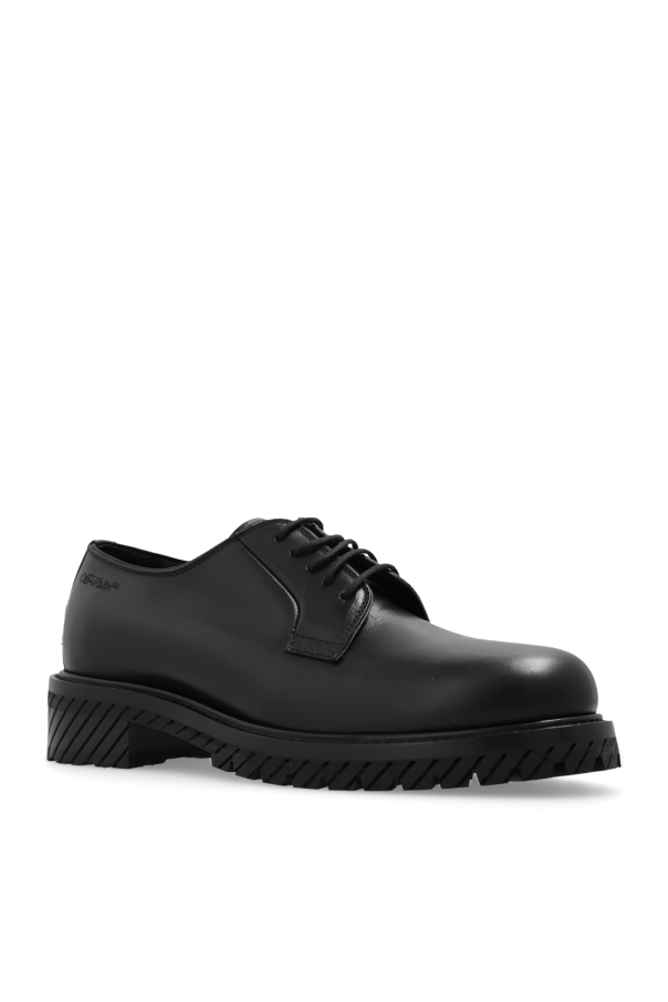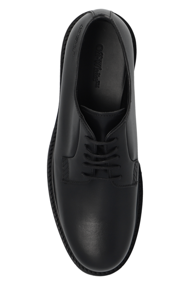 Black derby shoes from Off-White. Made of leather, this lace-up pair features an embossed logo and a textured rubber sole in black.