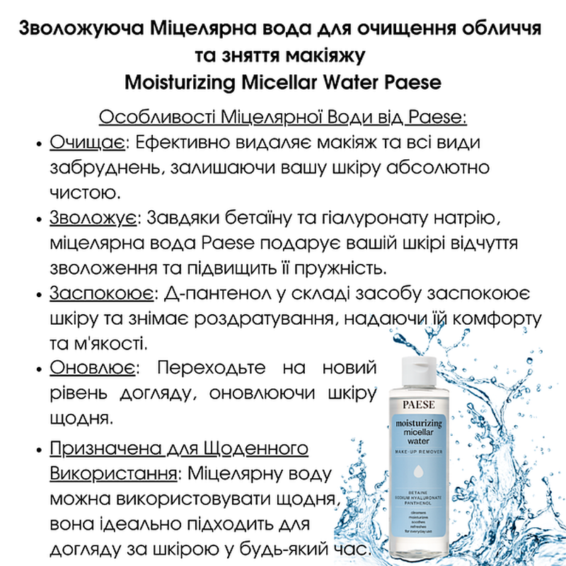 Увлажняет: Благодаря бетаину и гиалуронату натрия, мицеллярная вода Paese подарит вашей коже ощущение увлажнения и повысит ее упругость.💫