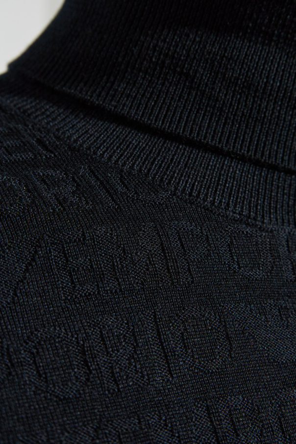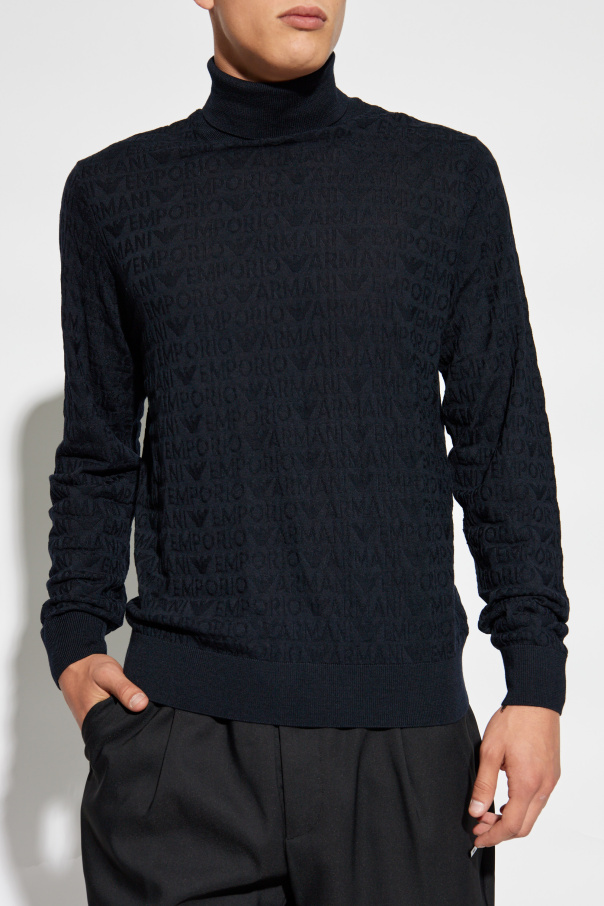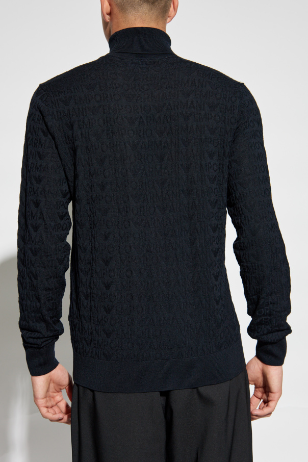 Introducing the Emporio Armani Wool Turtleneck with Monogram, a quintessential piece from our exclusive collection. This turtleneck exudes sophistication and timeless elegance, designed for the discerning gentleman. Shape and Fit: The turtleneck boasts a classic, form-fitting silhouette, offering a sleek and refined appearance. Long sleeves are finished with ribbed cuffs, ensuring a snug fit, while the hem also features a ribbed finish for enhanced comfort and style. Pattern and Details: Adorned with a subtle monogram pattern, this piece features a repeating motif of the designer’s name or brand, intricately woven into the fabric. The monogram, tonally aligned with the material, lends a discreet yet distinctive charm. Material: Crafted from premium wool, the turtleneck promises unparalleled warmth and comfort. The fabric appears soft and stretchy, underscoring its luxurious nature. Color: Presented in a classic black hue, this turtleneck epitomizes elegance and versatility, seamlessly complementing various wardrobe staples. Why Choose This Product? Exquisite monogram detailing for an understated yet unique look. High-quality wool ensures warmth and comfort. Classic black color offers timeless style and versatility. Designed by Emporio Armani, synonymous with luxury and innovation. Perfect fit with ribbed cuffs and hem for added sophistication.
