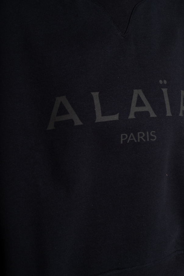 Black loose-fitting crewneck sweatshirt from Alaia. Made of organic cotton, this garment is enriched by a logo print and ribbed trims at the crew neck, hem and cuffs.