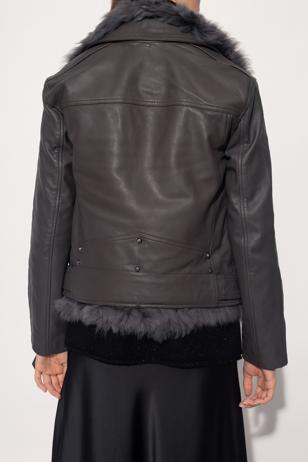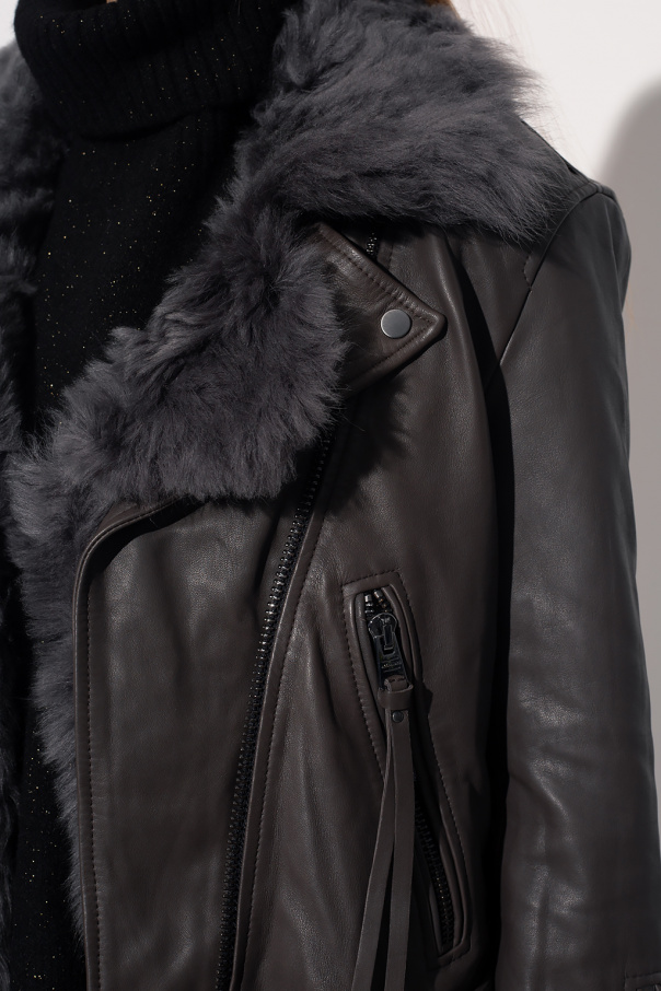 Grey ‘Luna’ biker jacket from AllSaints. Made of sheep leather, this model features a two-way zip, two zip pockets, one snap-fastened flap pocket, zipped cuffs, buckle belt at the hem and a detachable vest crafted from dyed sheep leather and fur.