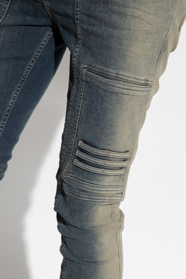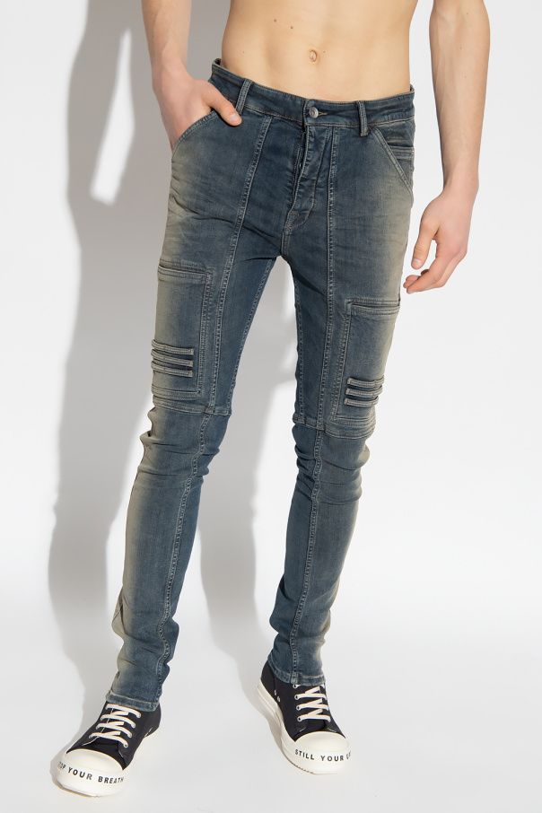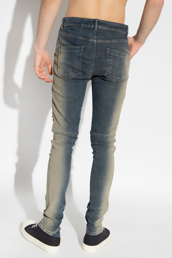 Navy blue and grey jeans from Rick Owens DRKSHDW. Crafted with a vintage effect, this pair falls with tapered legs and features hidden button closures, four slip pockets and decorative patches.