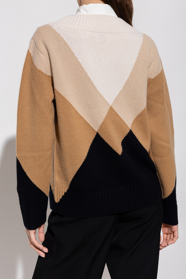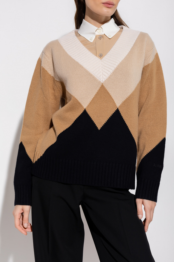Cream, beige and black ‘Lilah’ sweater Burberry. Made of cashmere, this garment features a diamond pattern, logo embroidery and ribbed trims at the V-neck, hem and cuffs.