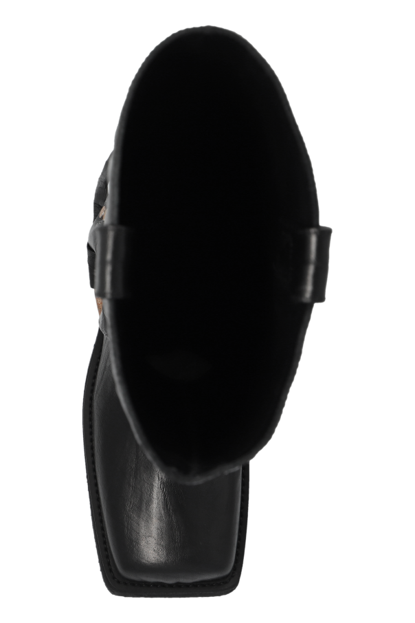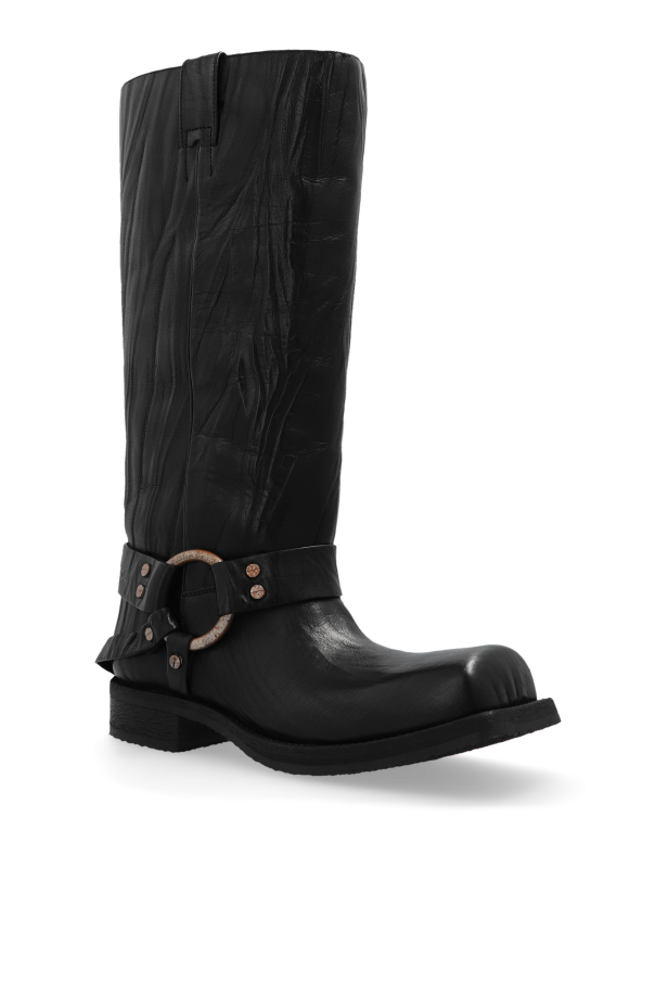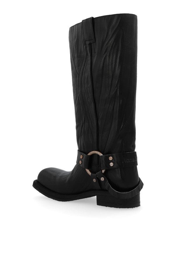 Introducing an emblem of exquisite craftsmanship and bold style, the Acne Studios Leather Biker Boots. Crafted with the highest attention to detail, these mid-calf boots are a testament to timeless design and enduring quality. The outer layer, made from premium black leather, features a distinctive grainy texture that adds depth and character to the boots. This rugged elegance is further accentuated by a wide decorative strap adorned with a copper-toned metal buckle and ring, creating a striking contrast against the black leather. Riveted elements on the strap enhance the boots' decorative allure, embodying a fusion of luxury and rebellion. The boots' low, stable heel epitomizes the biker style's foundation—durability and comfort for any journey. Rounded toes introduce a touch of classic elegance, balancing the boots' robust, motorcycle-inspired aesthetic. The sole, crafted from rubber, promises solid, anti-slip performance underfoot. Notably, these boots are slip-on, ensuring ease of wear without compromising their sleek silhouette. While the absence of visible branding allows the design's quality and details to speak for themselves, these boots are unmistakably Acne Studios—an icon of modern luxury. Without a doubt, they are a versatile and striking addition to any discerning wardrobe. Why Purchase These Boots? Exceptional quality and design from renowned Acne Studios. Luxurious, grainy-textured leather that exudes character and durability. Eye-catching copper-toned metal accents for a unique, contrasting look. Stable, low heel and anti-slip rubber sole for supreme comfort and safety. Timeless biker style that marries classic elegance with a touch of rebellious spirit.