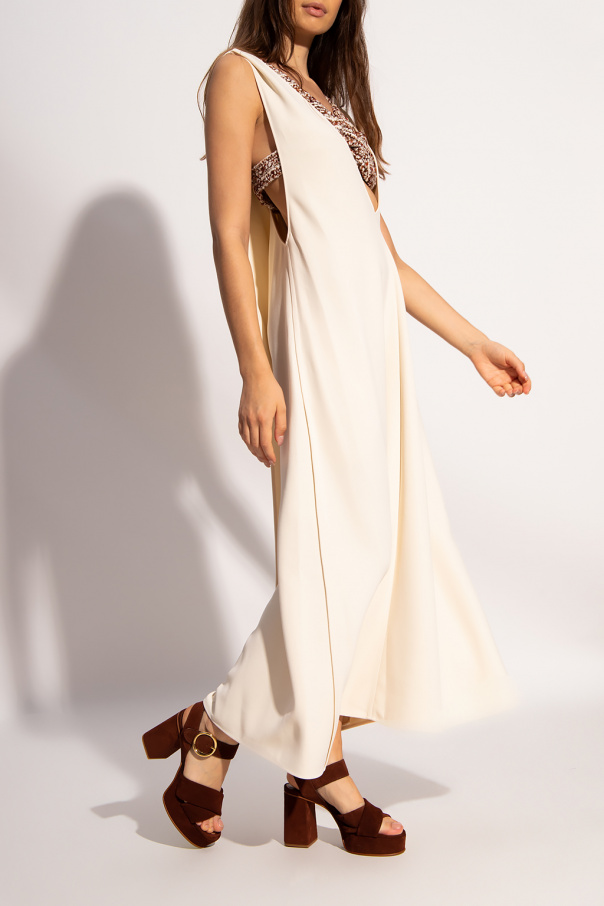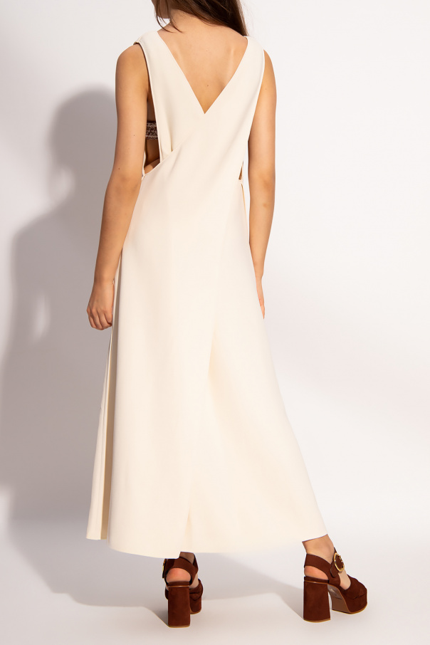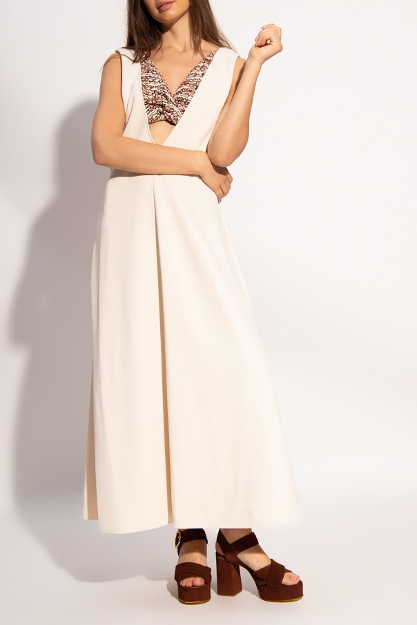 Cream sleeveless dress from Proenza Schouler. This loose-fitting V-neck design has side pockets and comes with a detachable brown bra with a twisted front.