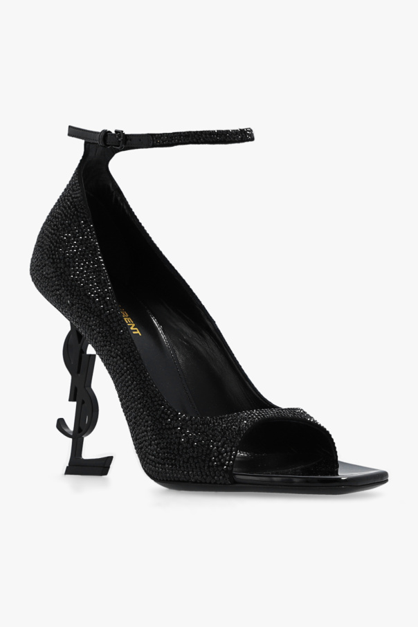 Black ‘Opyum’ peep-toe pumps from Saint Laurent. Made of goat leather with glossy crystals all-over, this model features an adjustable ankle strap with a buckle, a square toe, a YSL heel and a black leather sole.