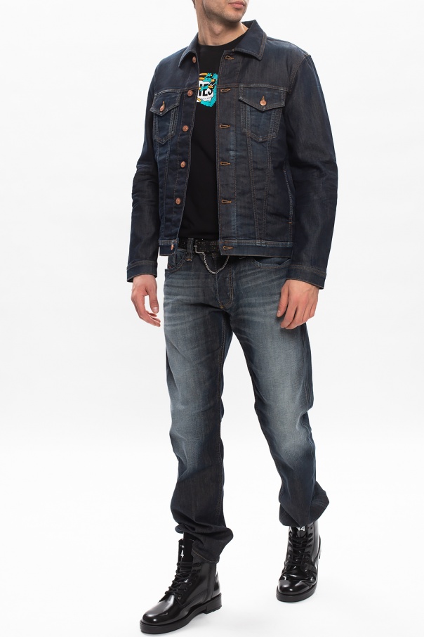 Navy blue denim jacket from Diesel. Boasting exposed orange seams and a black logo appliqué, this style fastens via buttons and employs two button-fastened flapped pockets and two welt pockets.