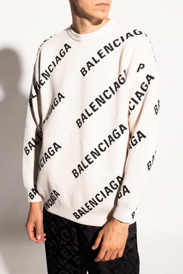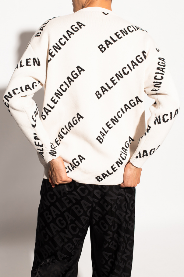 White crewneck sweater from Balenciaga. Crafted from a cotton and wool blend, this style features an all-over jacquard logo pattern and ribbed trims on the bottom hem and cuffs.