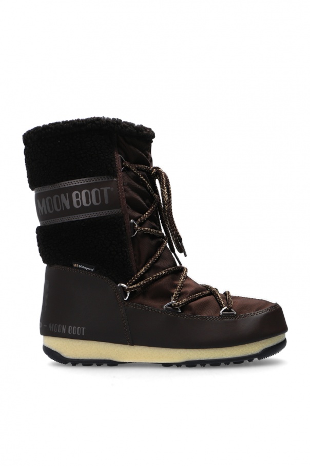 Brown ‘Monaco’ waterproof snow boots from Moon Boot. Trimmed with faux shearling, this model features a printed logo pattern and rubber sole in grey and black.