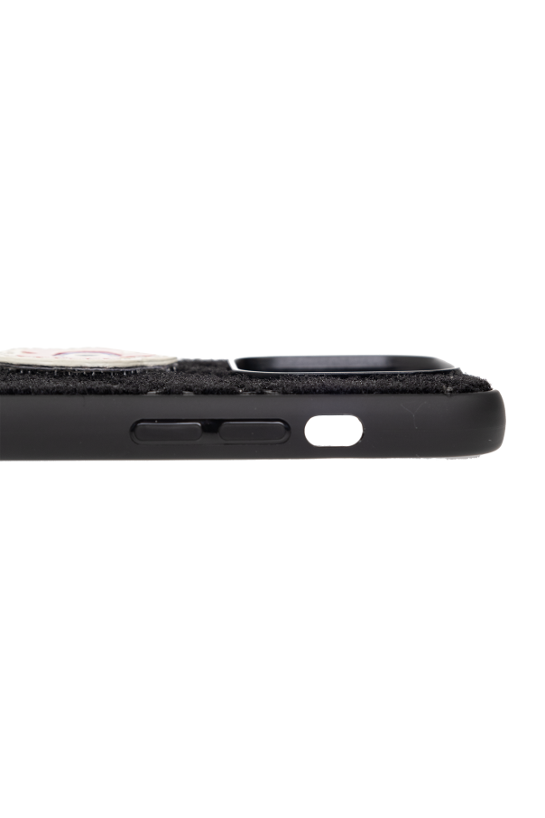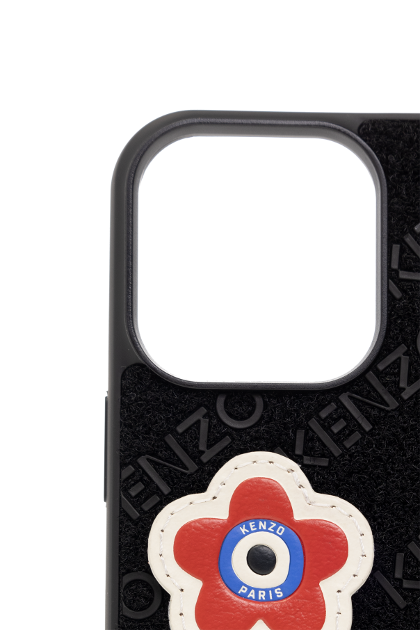 Black iPhone 14 Pro case with detachable, multicolored logo pins from Kenzo.