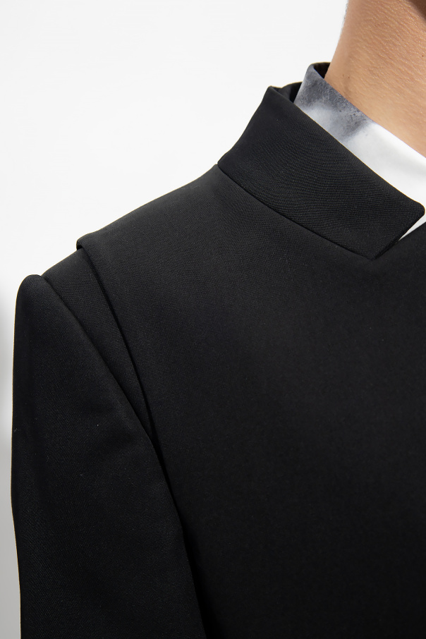 Black two-layered blazer from Alexander McQueen. Made of wool, this garment is complete with buttons, a double collar with peak lapels, two flap pockets, single rear vent and long sleeves with buttoned cuffs.