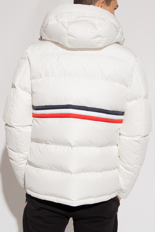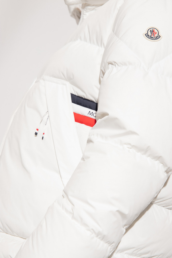 White ‘Fleole’ down jacket from Moncler. Enriched by all-over quilting, this style secures with a two-way zip and snaps and features a tricolour belt with navy blue, white and red topstitching and logo print at the waist, the brand's signature felt patch on the shoulder, a drawcord-adjustable hood and hem, two oversize zip pockets and long sleeves with elastic fabric trims.