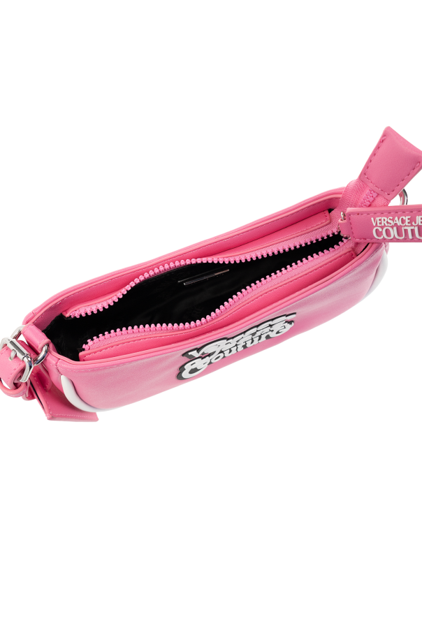 Pink shoulder bag from Versace Jeans Couture. Made of faux leather, this model is complete with a zip fastening, rubber logo, detachable plastic chain, adjustable shoulder strap, ID tag, silver-tone metal hardware and one internal compartment with one slip pocket.