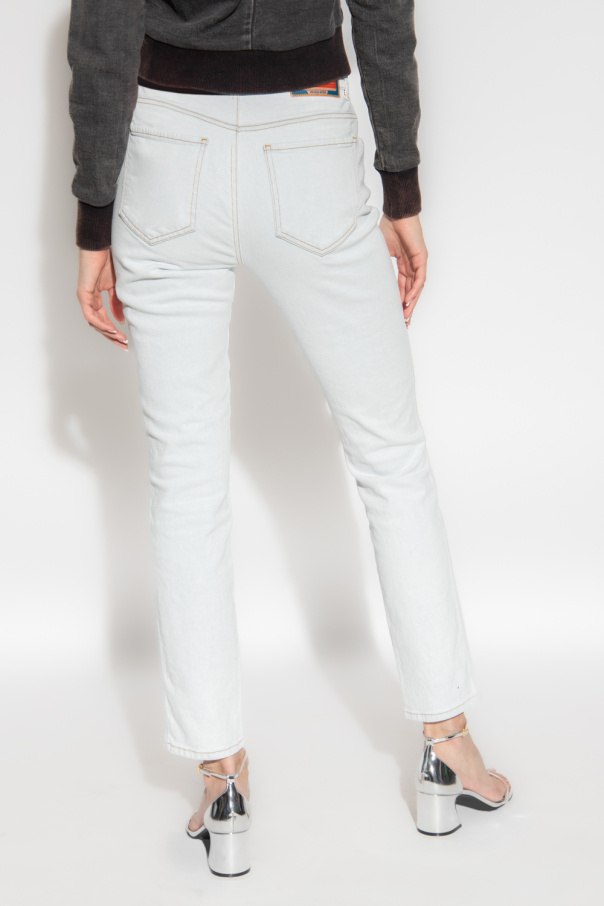 Light blue ‘1994’ jeans from Diesel. Made of cotton, this tapered pair features a zip and button closure, five slip pockets and logo patch in beige, red and blue at the back.