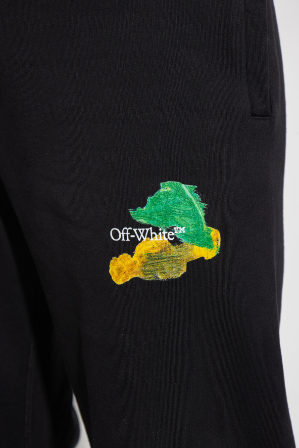 Black sweatpants from Off-White. Made of cotton, this pair is complete with an elastic drawstring waistband, multicolored logo print, the brand's signature arrows motif, two slip pockets, one pocket with velcro fastening and ribbed cuffs.