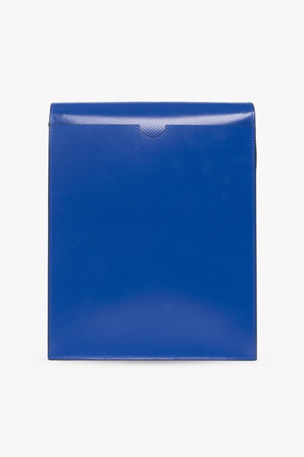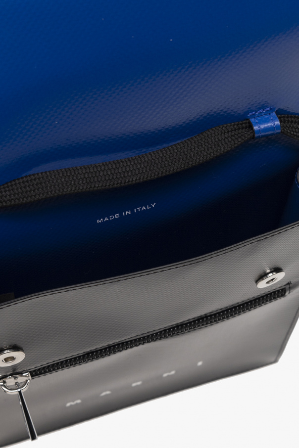 Black and dark blue ‘Tribeca’ shoulder bag from Marni. Printed with a white logo, this design features snap closures, a zip pocket on the front, a slip pocket at the back, an adjustable shoulder strap, silver-tone metal hardware and one internal compartment.