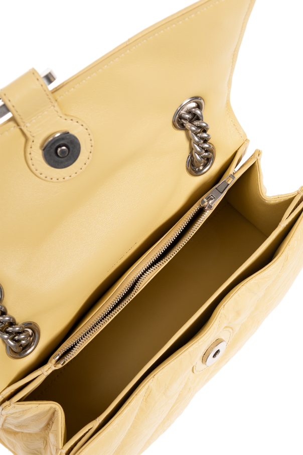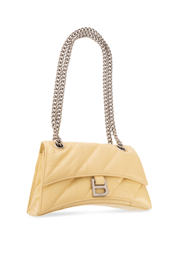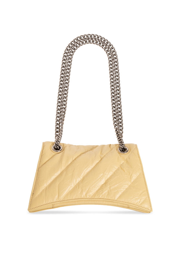 Light yellow ‘Crush Small’ shoulder bag from Balenciaga. Made of calf leather with a crease effect, this design features snap fastening, flap with a logo-engraved B detail, shoulder chain, silver-tone metal hardware and one internal compartment with two slip pockets and one zip pocket.