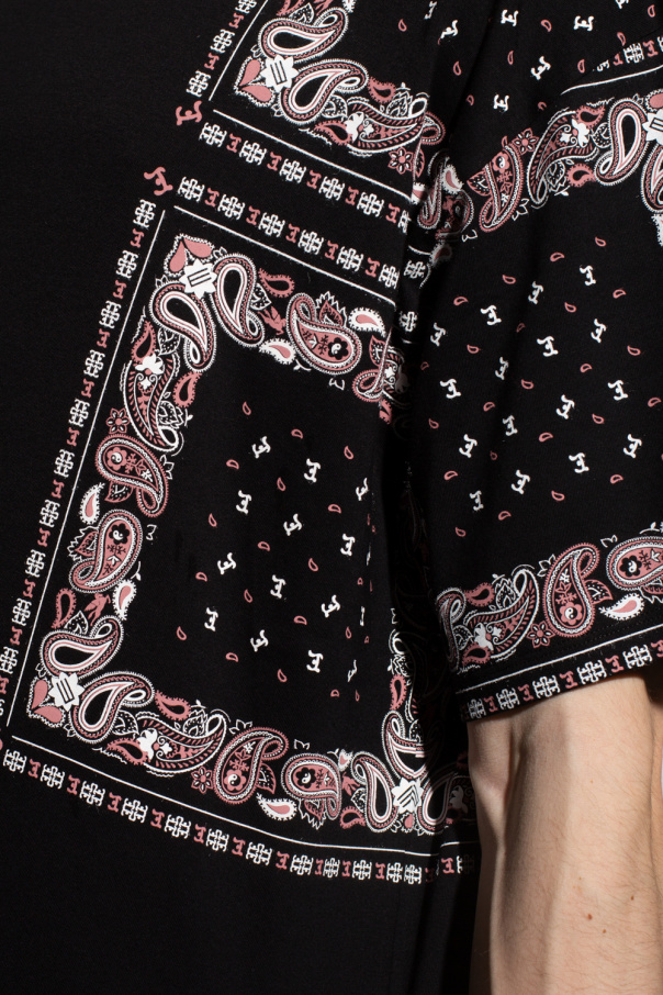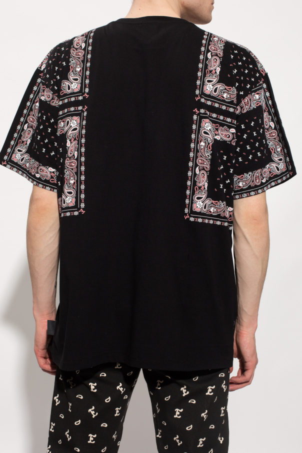 Black crewneck T-shirt from Etro. Made of cotton with an oversize silhouette, this style features short sleeves, an elasticated collar, a logo tab sewn on the side and paisley bandana and ‘E’ prints in white and pink.