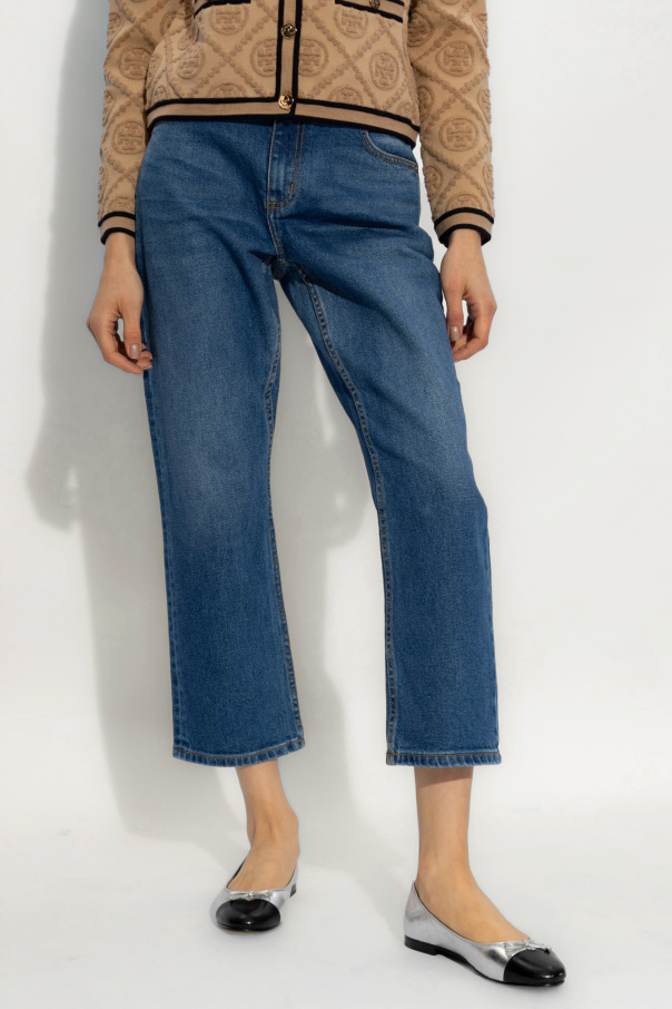 Dark blue flared jeans from Tory Burch. Fastened with a button and zip, this cropped pair features the brand’s logo at the back and five slip pockets.