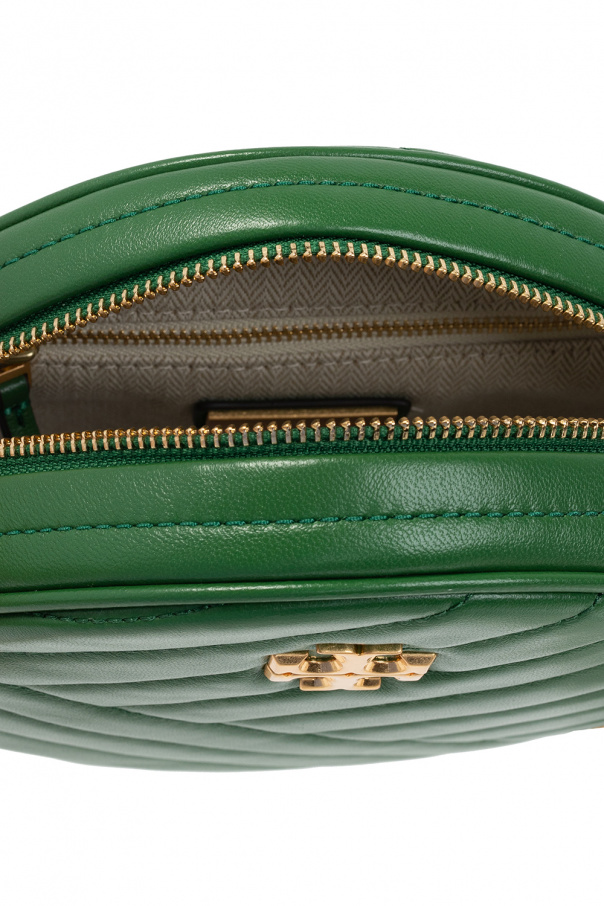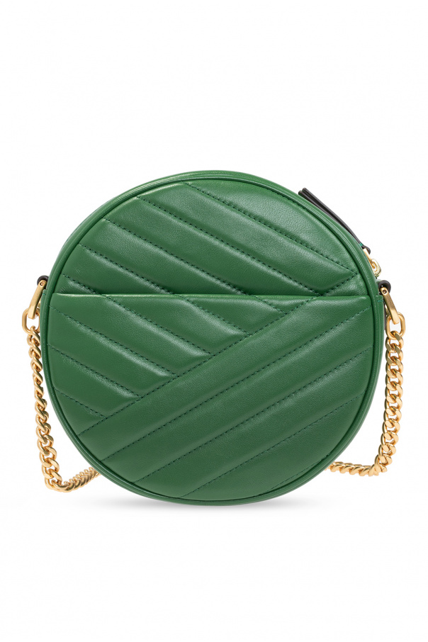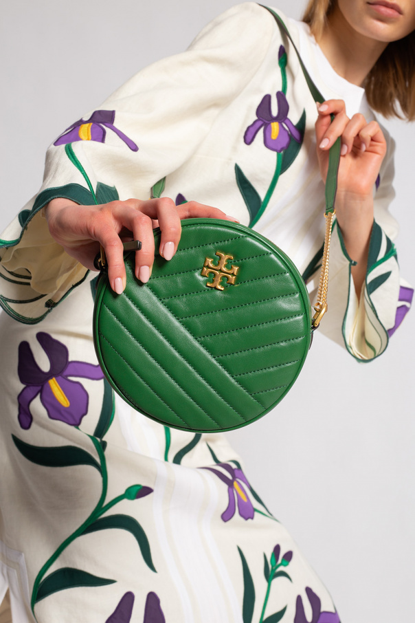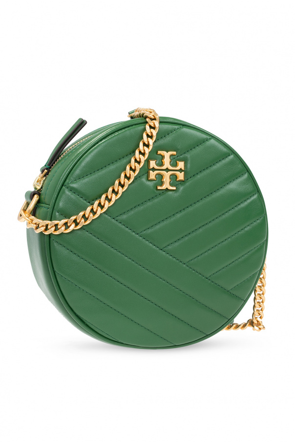 Green ‘Kira’ quilted shoulder bag from Tory Burch. Made of leather, this design fastens with a zip and is enriched by a metal logo. It is complete with a back pocket, shoulder strap with chain inserts, gold-tone metal hardware and one internal compartment with two slip pockets and one zip pocket.
