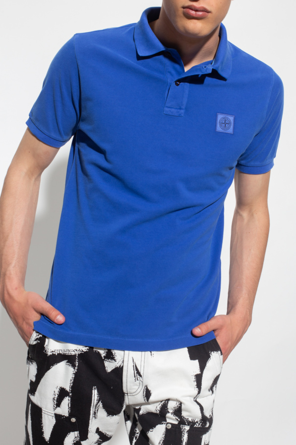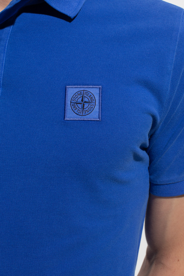 Dark blue polo shirt from Stone Island. Crafted from cotton, this short sleeve design features an embroidered logo pattern, button fastenings and ribbed trims at the collar and cuffs.