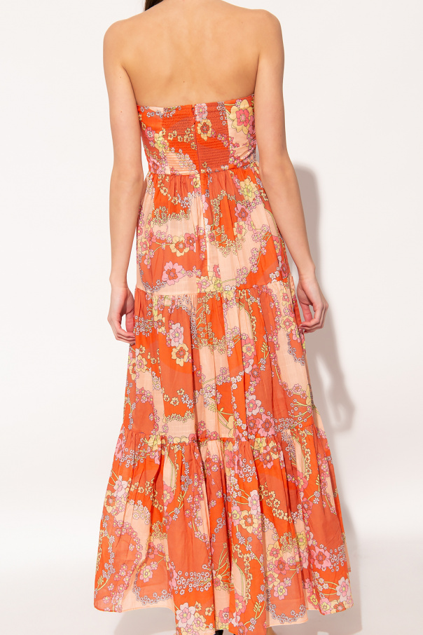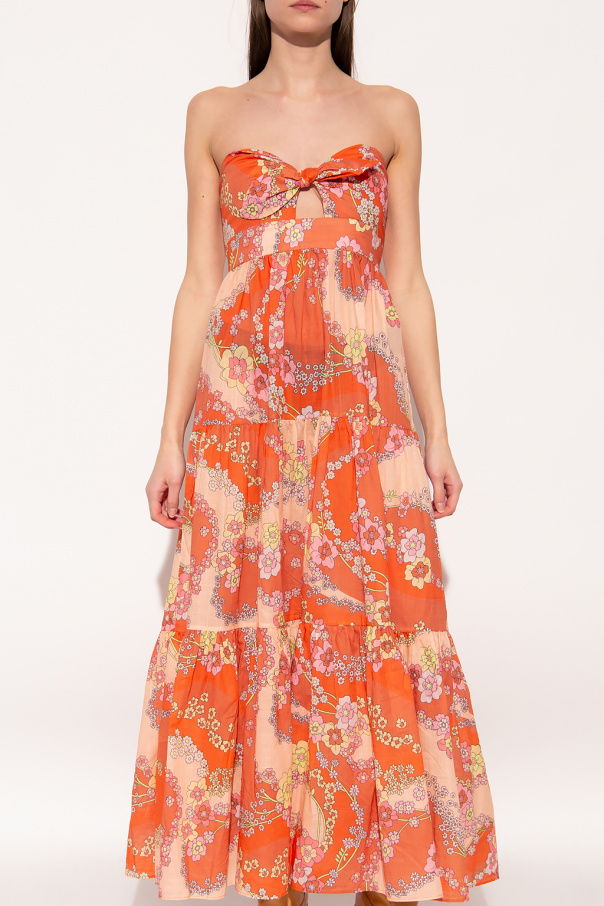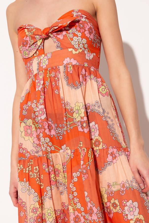 Multicoloured dress from Zimmermann. Made of cotton with a flared silhouette, this style features a floral print, denuded shoulders, a distinctive tie fastening on the front and a back zipped accompanied by a hook & eye closure.